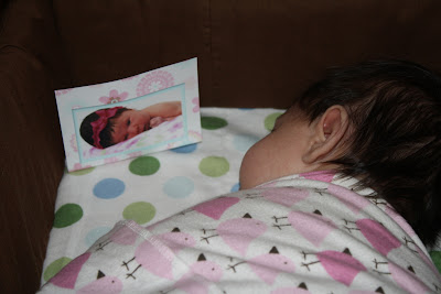 Josefine has a cousin who was born only a few weeks before her. Her name is Ellenora and she's just a doll of a baby! She and Josefine look quite similar, if you ask me. We read somewhere that you can put pictures of faces in baby's crib/cradle. Because babies dig faces, you see. :) So, I thought I'd try this idea on for size. We put a picture of Ellenora in Josefine's crade for a few of her naps. Each time, she fell asleep facing it! It was sweet, but we also realized (the longer we kept the picture in there) that she was effectively avoiding sleep because she was enjoying Ellenora so much! Out with that idea...we want this girl to sleep during naptime! As short-lived as it was, it was sweet and I snapped a picture of the sweetness. Well, Ellenora - Josefine already loves you! ♥